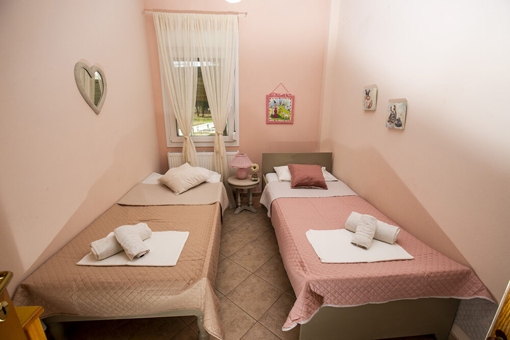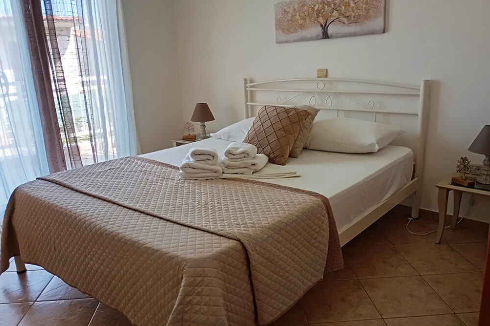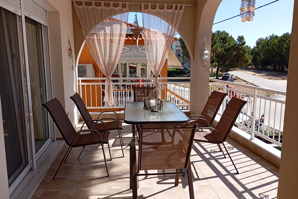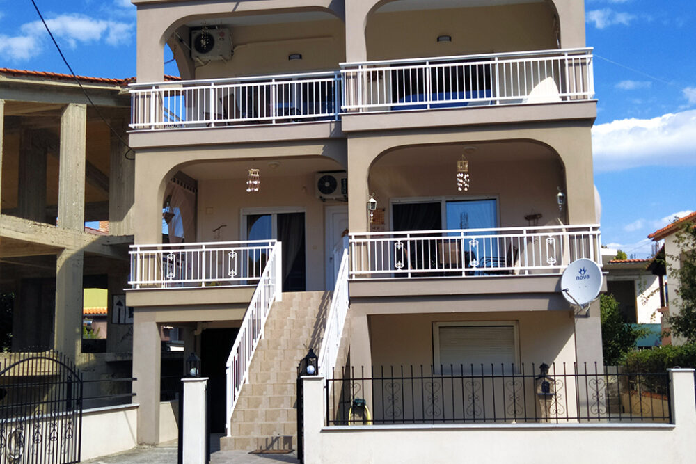Апартамент Стела, апартамент с 3 спални, се намира на 1-вия етаж от 3-етажна сграда и се намира пред плажа и на 600 м от центъра на Керамоти. В него могат да се настанят до 7 души, което го прави идеален за две семейства или за група хора.