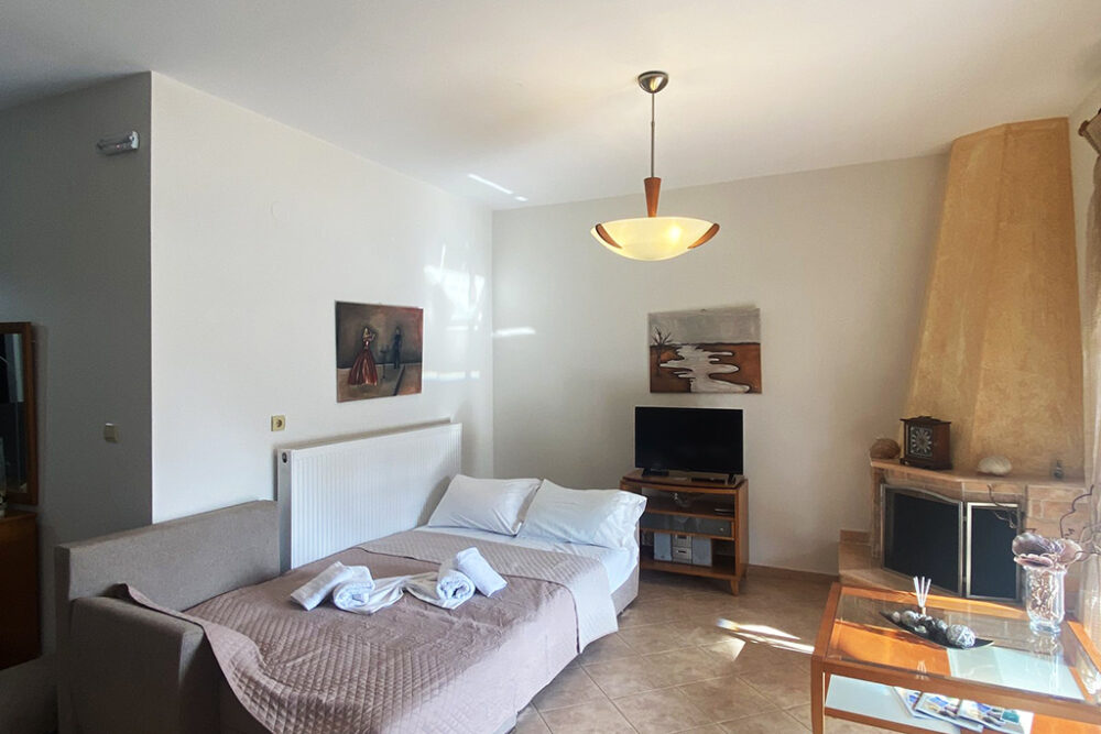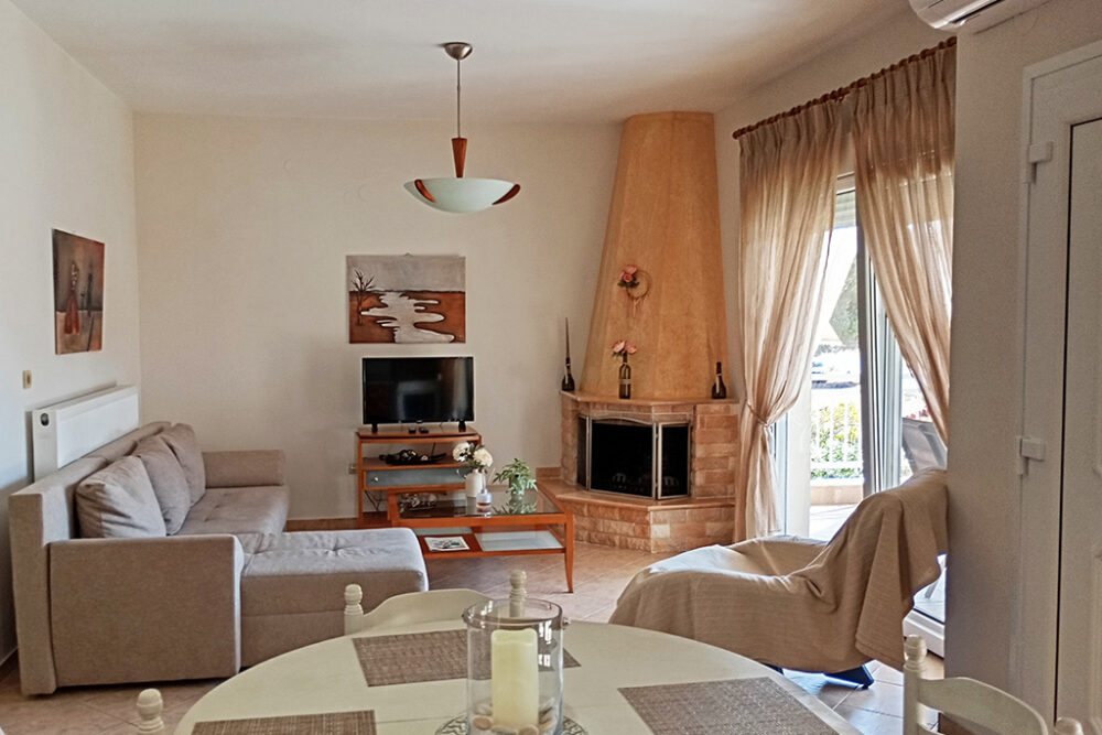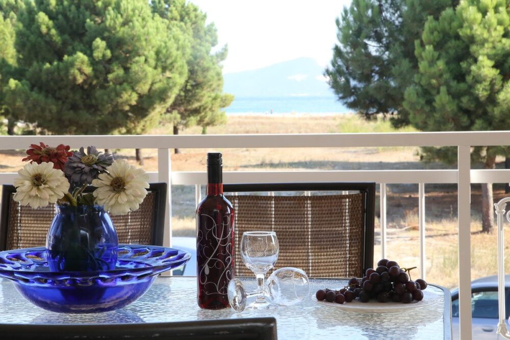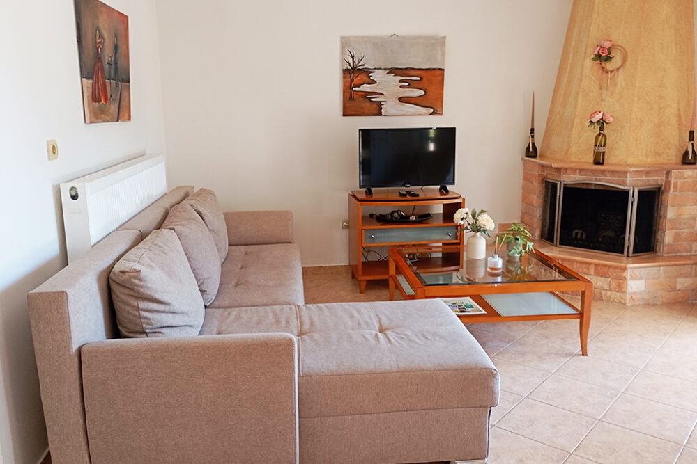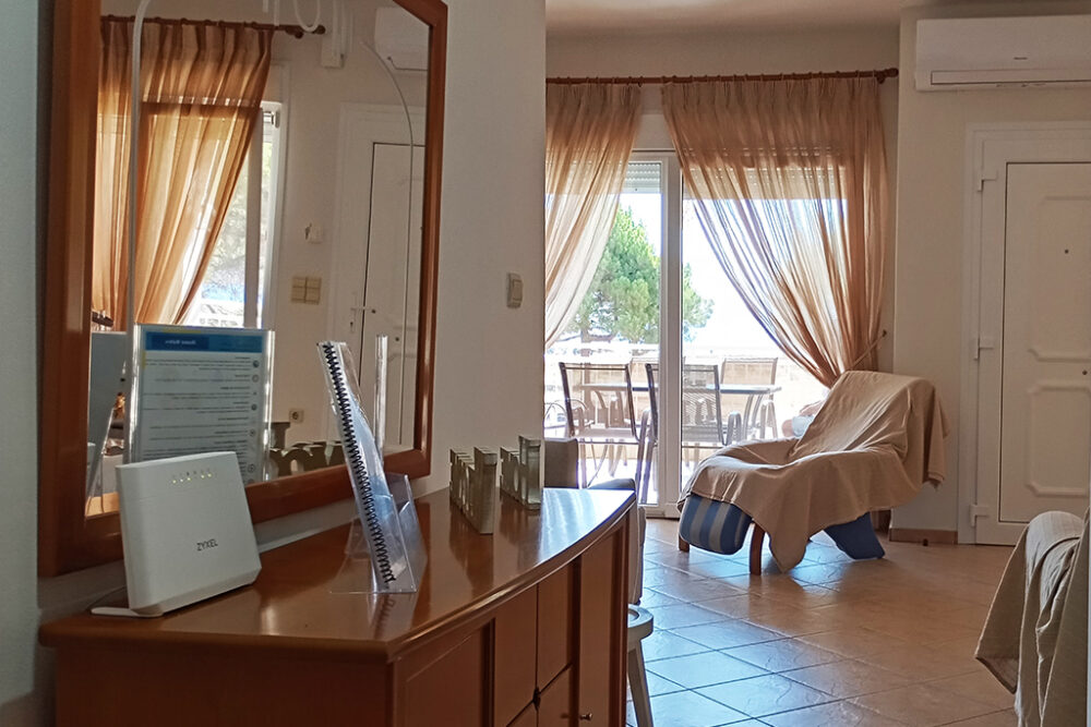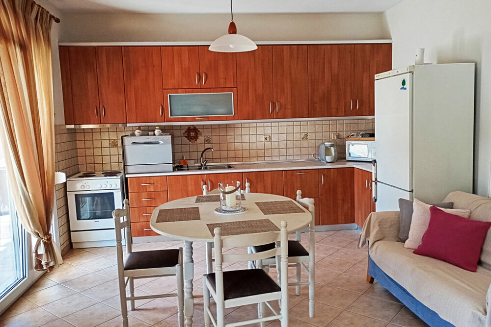 Хубави мебели, удобна и просторна всекидневна, напълно оборудвана кухня с трапезария, сателитна телевизия, климатик в хола са само малка част от удобствата, които ще намерите в този апартамент. Разположен пред морето и на 600 м от центъра на Керамоти, ще можете да стигнете до всяко място за няколко минути.