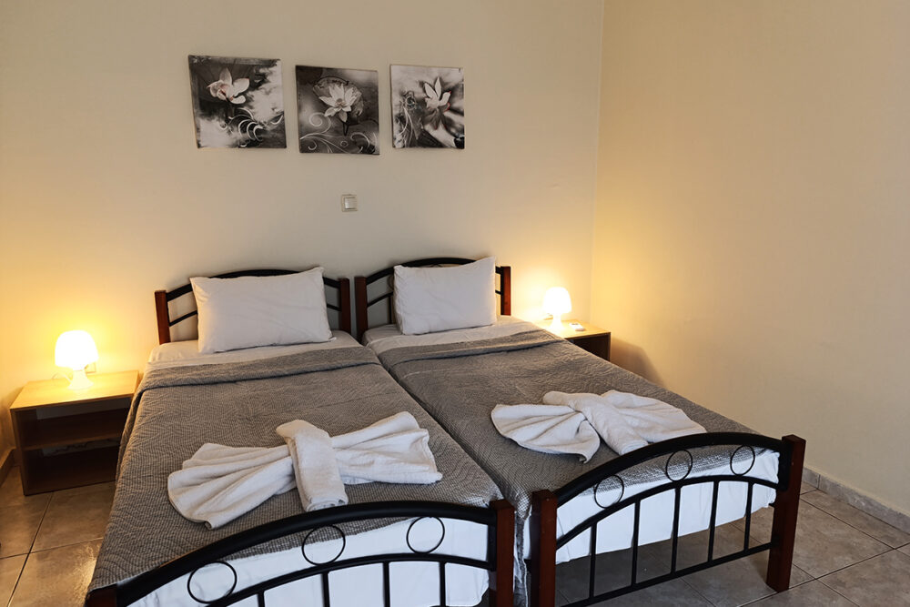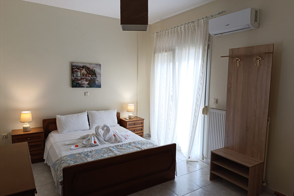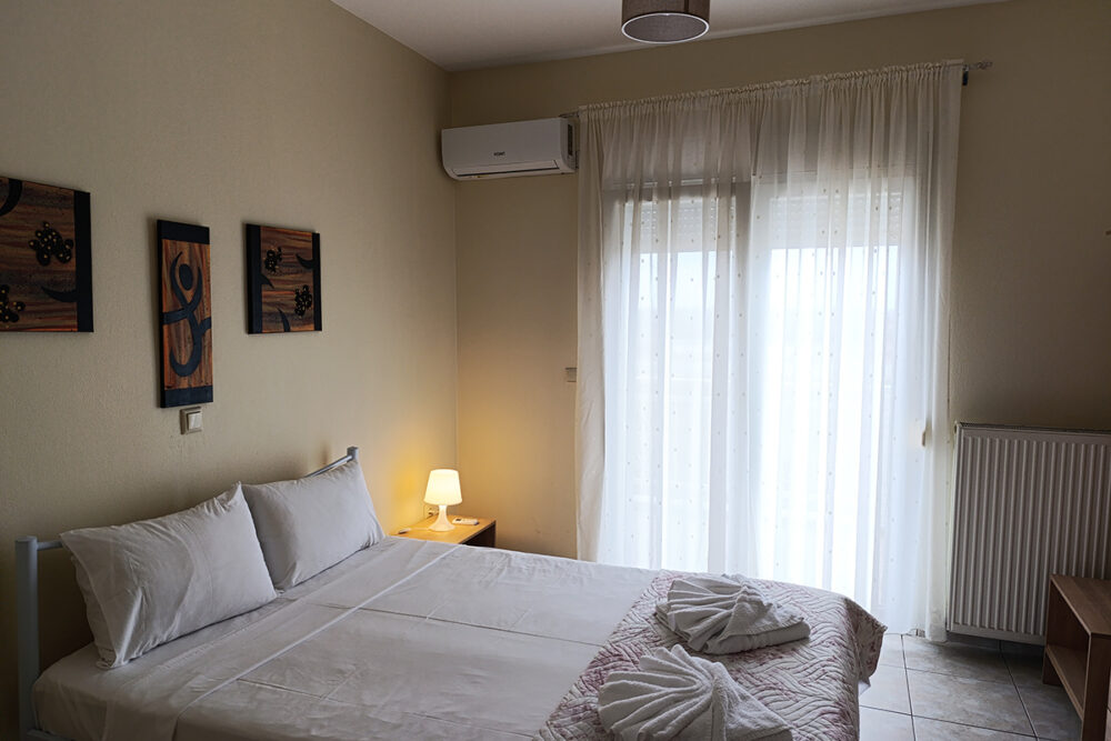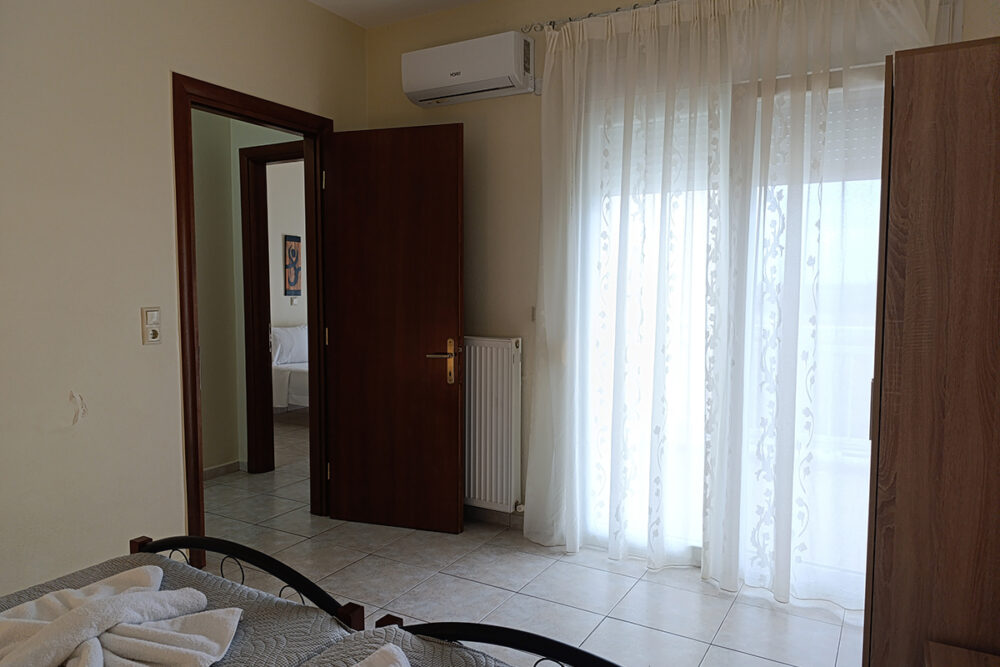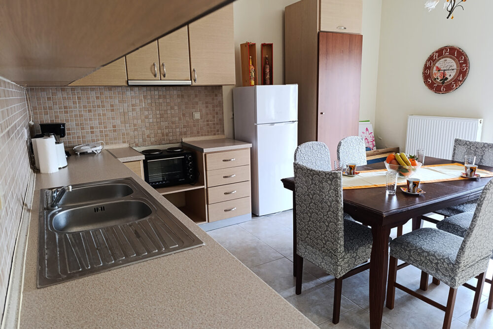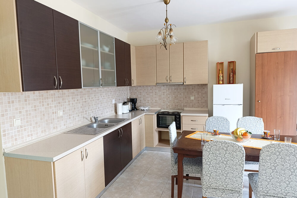 Discover apartment Angela which is located on the Ground floor (right side) of a two storey building. It is 350 m from the center and 750 m from the beach of Keramoti. The apartment can accommodate up to 8 people and therefore is considered “ideal” for a family or friends.