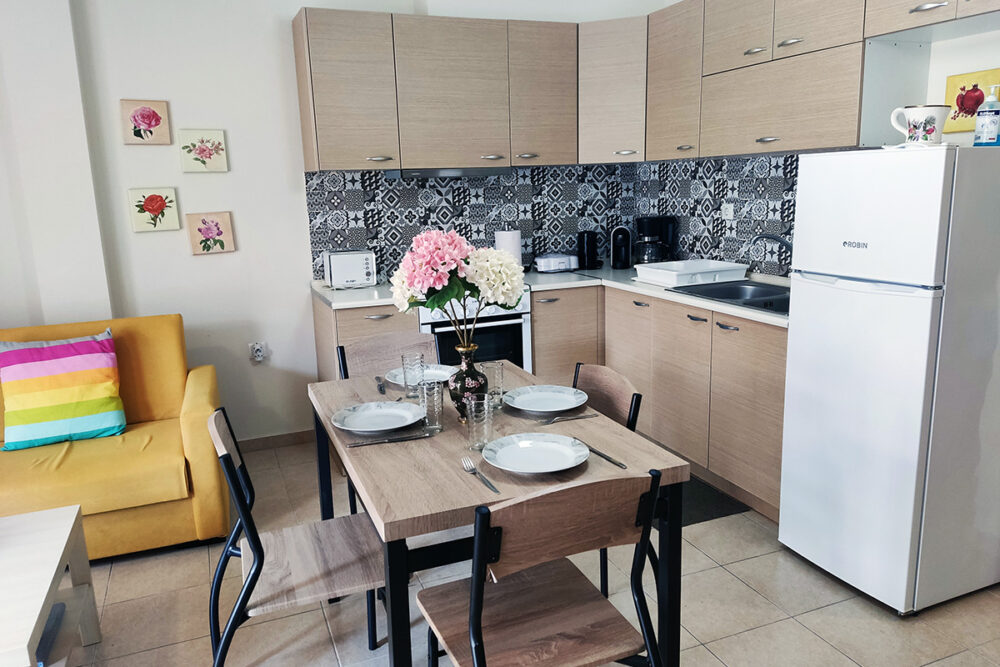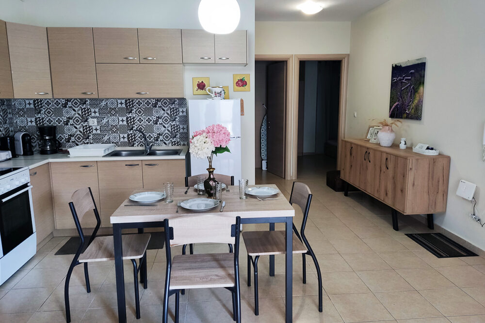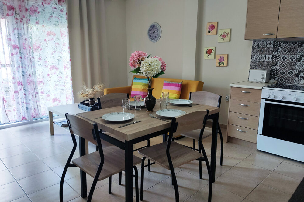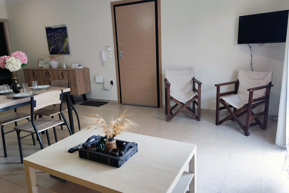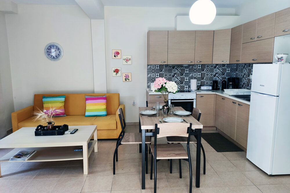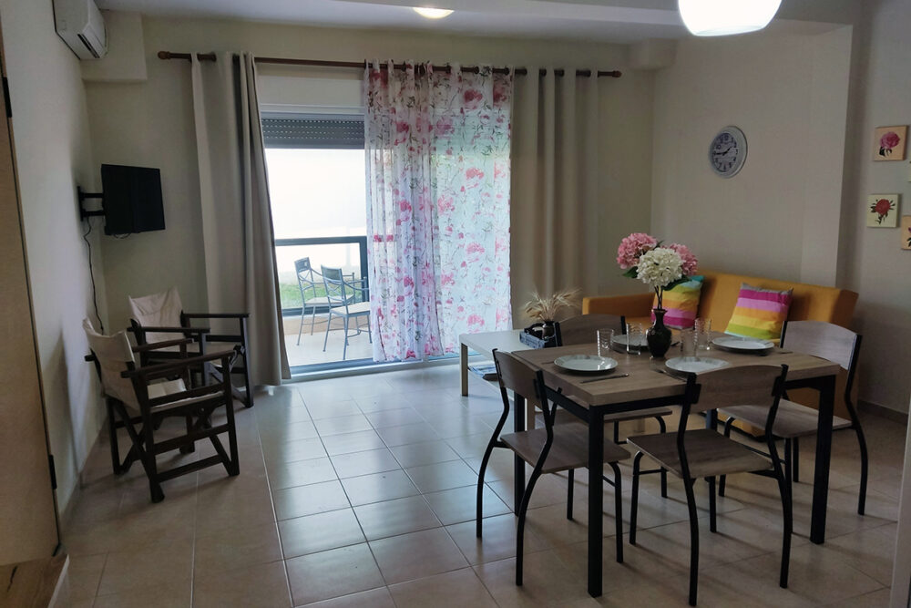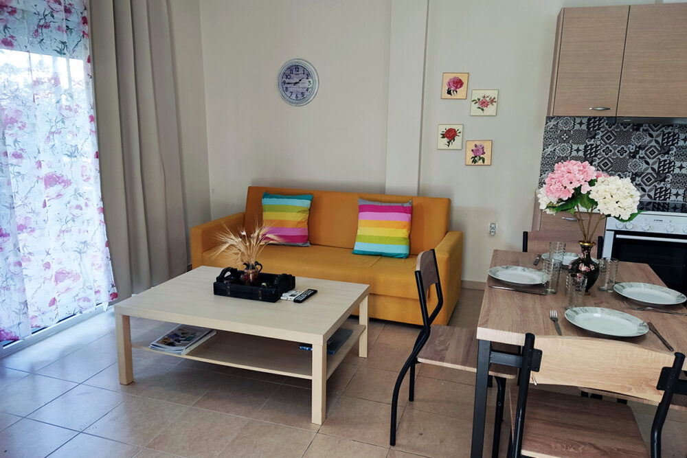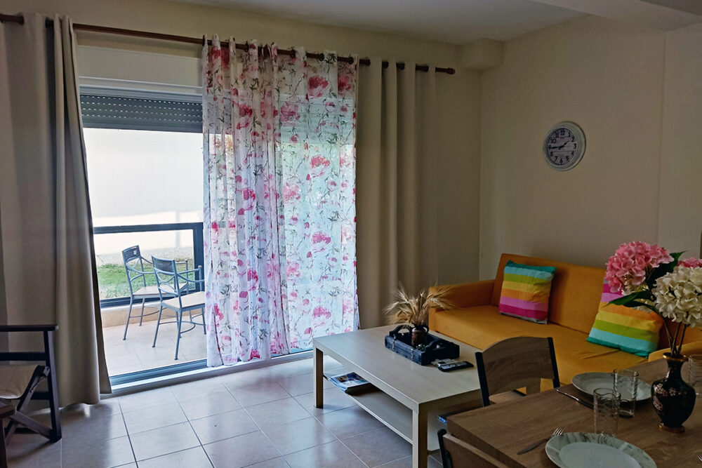 Discover apartment Eftalia, a 2 bedroom apartment which is located on the ground floor and it can accommodate up to 5 people therefore it is “ideal” for families or friends who would like to spend their vacation in a seaside place. The open-plan space with a fully equipped kitchen, 2 bedrooms, 1 bathroom and a stylish living area, overlooking the garden of the complex.